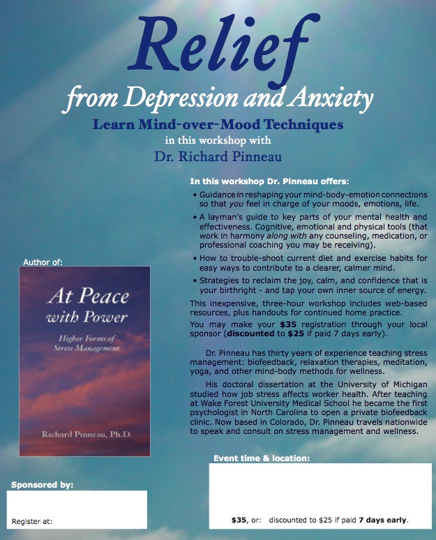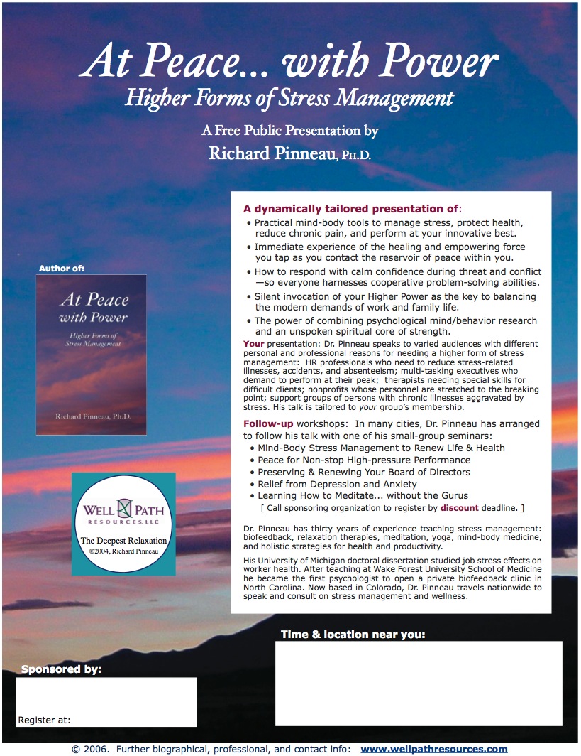 Downloadable Flyers Describing Presentationsfrom WellPath Resources, LLCFREE PUBLIC PRESENTATIONAt Peace... with Power: Higher Forms of Stress ManagementPresentation (60-90 min.) designed to accompany post-presentation book-signing and sales of “Deepest Relaxation” CD. Speaker is FREE to sponsoring nonprofit agency. [ Assistance with travel expenses is appreciated. ] Scheduling priority can be given to agencies who are sponsoring one or more of the workshops by Dr. Pinneau that are listed on this page (see the MS Word .docs below for workshop arrangements) and to agencies who can arrange additional presentations within their communities. High-resolution .pdf file for color printing (800K) Smaller (not for printing) JPEG color graphic of flyer (330K) for preview in browser. Details of usual revenue-sharing arrangements with workshop (below) sponsors: Sponsoring workshops within U.S., outside Colorado (no download .doc yet). Sponsoring workshops - special within Colorado. Sponsoring workshops - special within Pueblo County. TRAINING WORKSHOPSYour Board of Directors: Development SessionDesigned for a Directors' Retreat or 2-3-hour development meeting. High-resolution .pdf file for color printing (280K) Session overview suitable for emailing in Colorado. Web-viewable page targeted for Colorado. Stress Management: Renew Your Life and HealthThree-hour workshop suitable for staff, membership, or general public. High-resolution .pdf file for color printing (500Kb) How to Teach Stress ManagementGives teachers, health professionals, and HR staff the skills and knowledge to train their own staff and clientele. Three-to-four hours. High-resolution .pdf file for color printing (300K) Relief from Depression and AnxietyLearn mind-over-mood techniques for depression and anxiety. Three-to-four hours. Printable JPEG graphic of flyer in color (300K) High-resolution .pdf file for color printing (300K) |